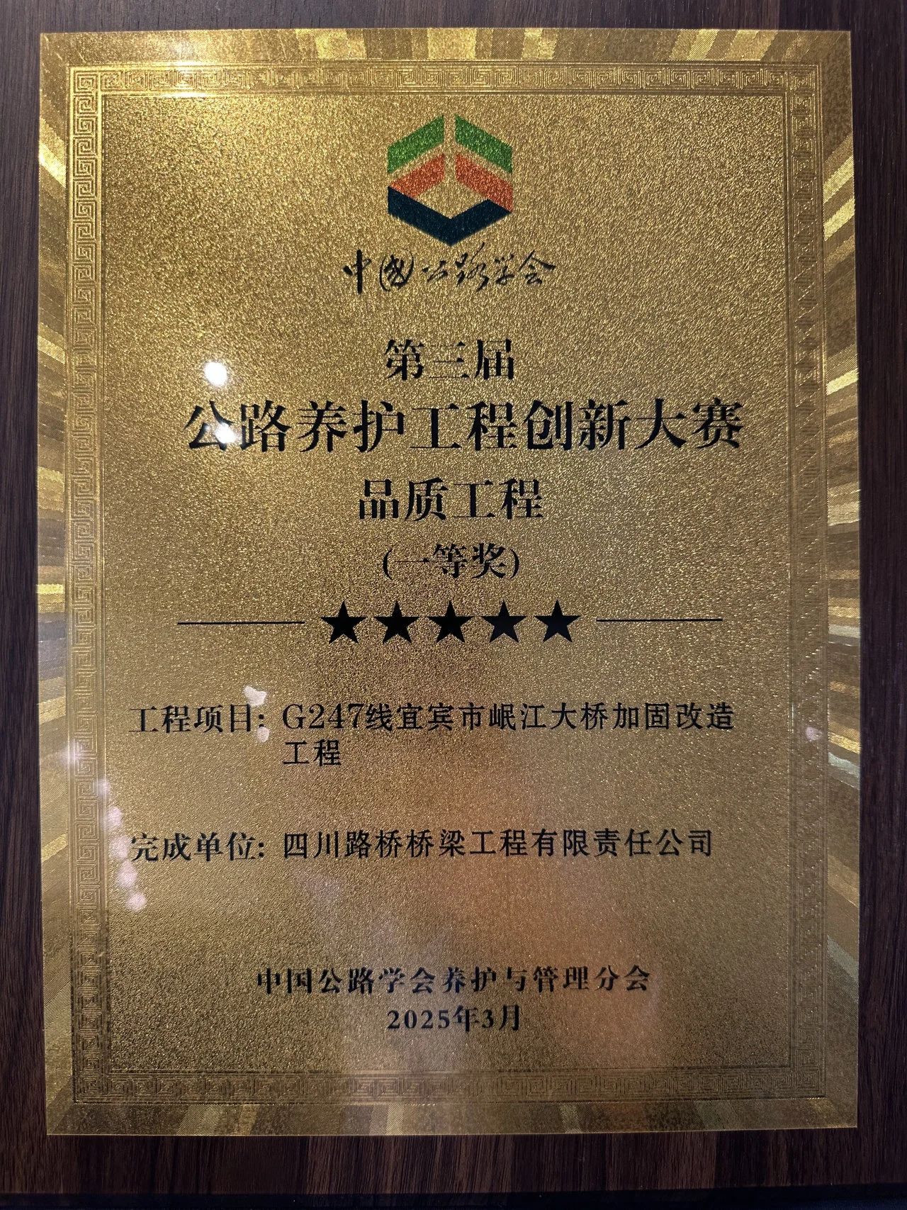 桥梁公司特种工程分公司荣获第三届公路养护工程创新大赛品质工程一等奖