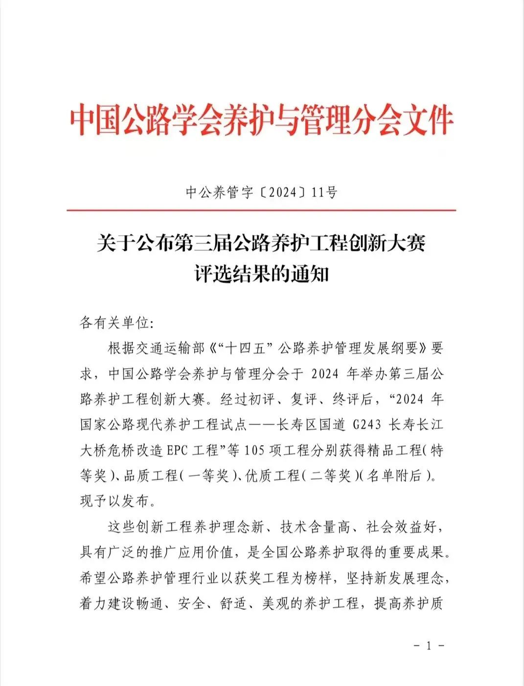 点赞!公司荣获第三届公路养护工程创新大赛品质工程一等奖